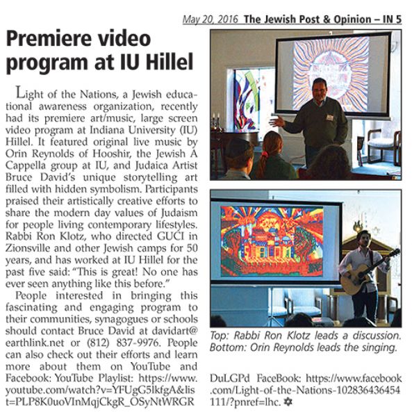 Featuring Orin Reynolds and members of two time National A Capella competition winners, Hooshir, singing Bruce David’s, Light of the Nations Experience, “Shalom, Shabbat Shalom” song! Art based on Bruce’s “Window of the Soul” stained glass window.